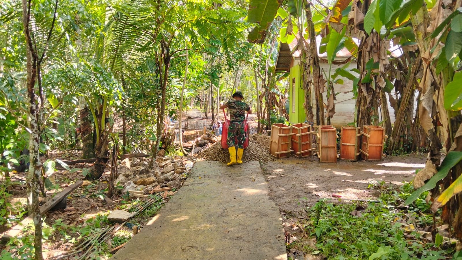 Meski demikian, kondisi tersebut tidak menyurutkan semangat Satgas pembangunan Jembatan Garuda. Dengan penuh dedikasi dan kerja sama, para personel terus bahu-membahu mengangkut material demi memastikan pembangunan berjalan sesuai rencana.