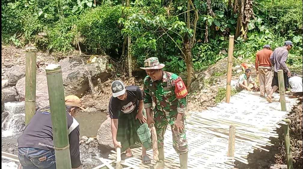 Probolinggo — Koramil 0820-17/Pakuniran bersama puluhan masyarakat melaksanakan kerja bakti berupa pembangunan jembatan darurat yang merupakan akses jalan penghubung di Desa Gunggungan Kidul, Kecamatan Pakuniran, Kabupaten Probolinggo, Senin (6/4).